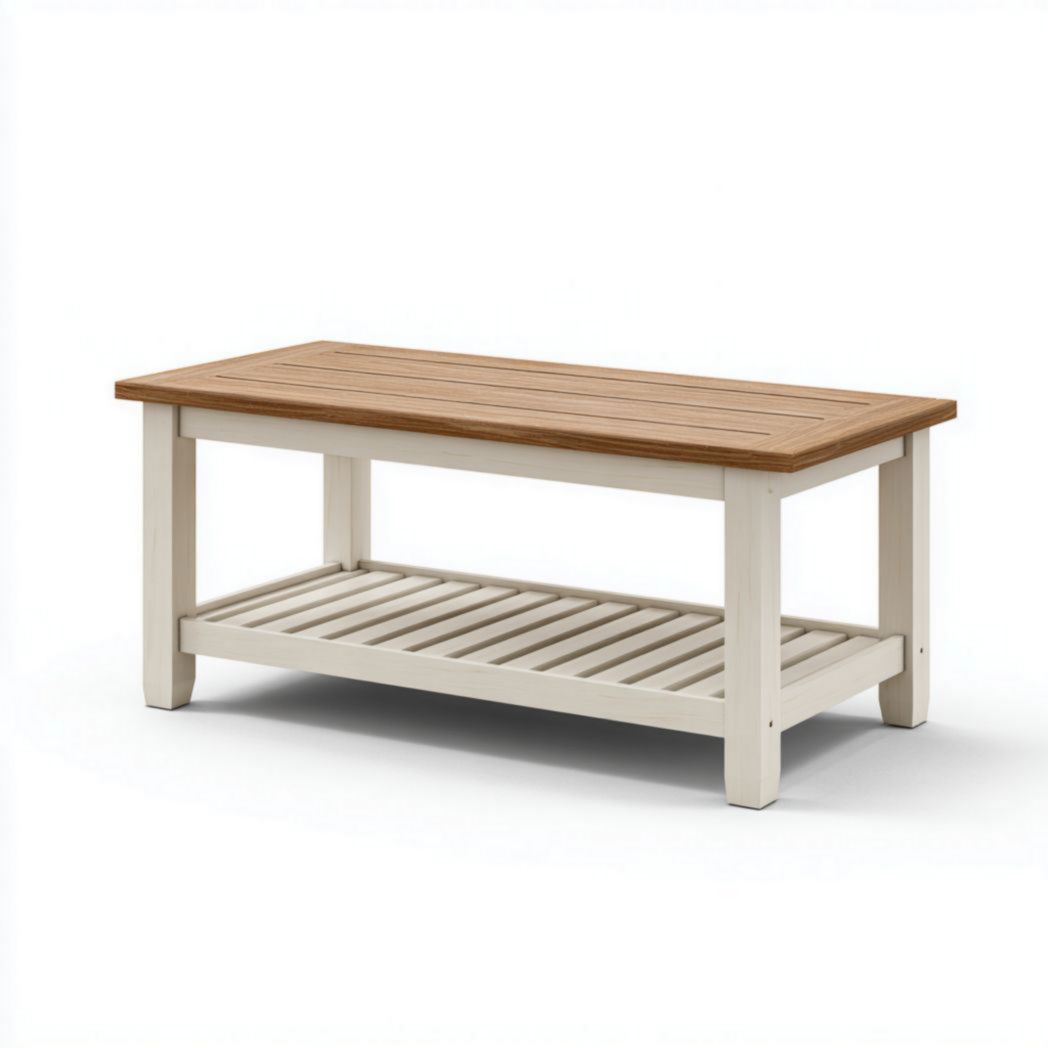 • Table basse rectangulaire à double étagère en coloris brun et blanc crème