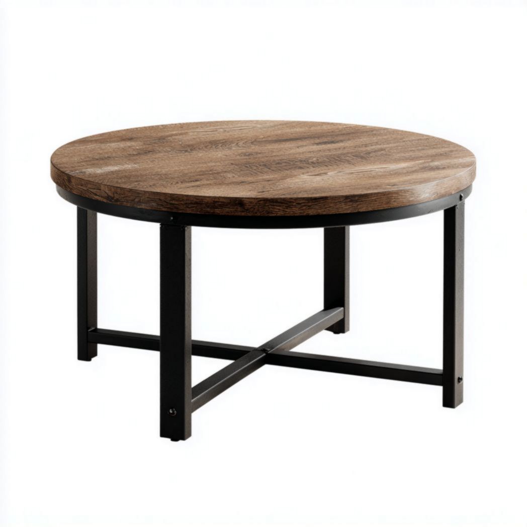 • Table basse ronde à structure métallique avec plateau brun foncé