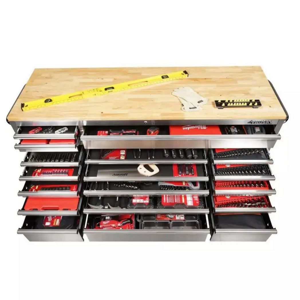 L'établi mobile de 72 po à 18 tiroirs en acier inoxydable est une armoire à outils qui allie parfaitement capacité de rangement et surface de travail fonctionnelle pour les passionnés d'outils. Il est construit en acier robuste de calibre 21. Cet établi mesure 24 po de profondeur, soit 6 po de profondeur que la plupart des armoires à outils roulantes standard, offrant un espace de rangement plus utile et suffisamment solide pour supporter 1 800 lb (827 kg) avec une capacité de 33 545 po³ (84 740 kg). Le dessus en bois massif de 1 po d'épaisseur est recouvert d'un revêtement protecteur en polyuréthane pour le protéger des intempéries. Le poste de travail est équipé d'un bloc d'alimentation avec 6 prises et 2 ports USB. Des revêtements de tiroir de qualité supérieure sont inclus pour empêcher les outils de bouger. Chaque tiroir est équipé de glissières à roulement à billes à fermeture douce d'une capacité de 100 lb (45 kg). Le tiroir supérieur long et les trois tiroirs inférieurs sont équipés de doubles glissières à fermeture amortie d'une capacité de charge de 45 kg (100 lb) pour une capacité de charge accrue jusqu'à 90 kg (200 lb), ce qui permet de ranger des articles plus lourds et encombrants. Ce poste de travail mobile est équipé de six roulettes pivotantes de 12,7 cm x 5,1 cm (5 po x 2 po) et d'une poignée latérale tubulaire en acier, facilitant les déplacements, même à pleine charge. Le centre de travail mobile dispose également d'un système de verrouillage interne à clé, avec 2 clés fournies, pour plus de sécurité.